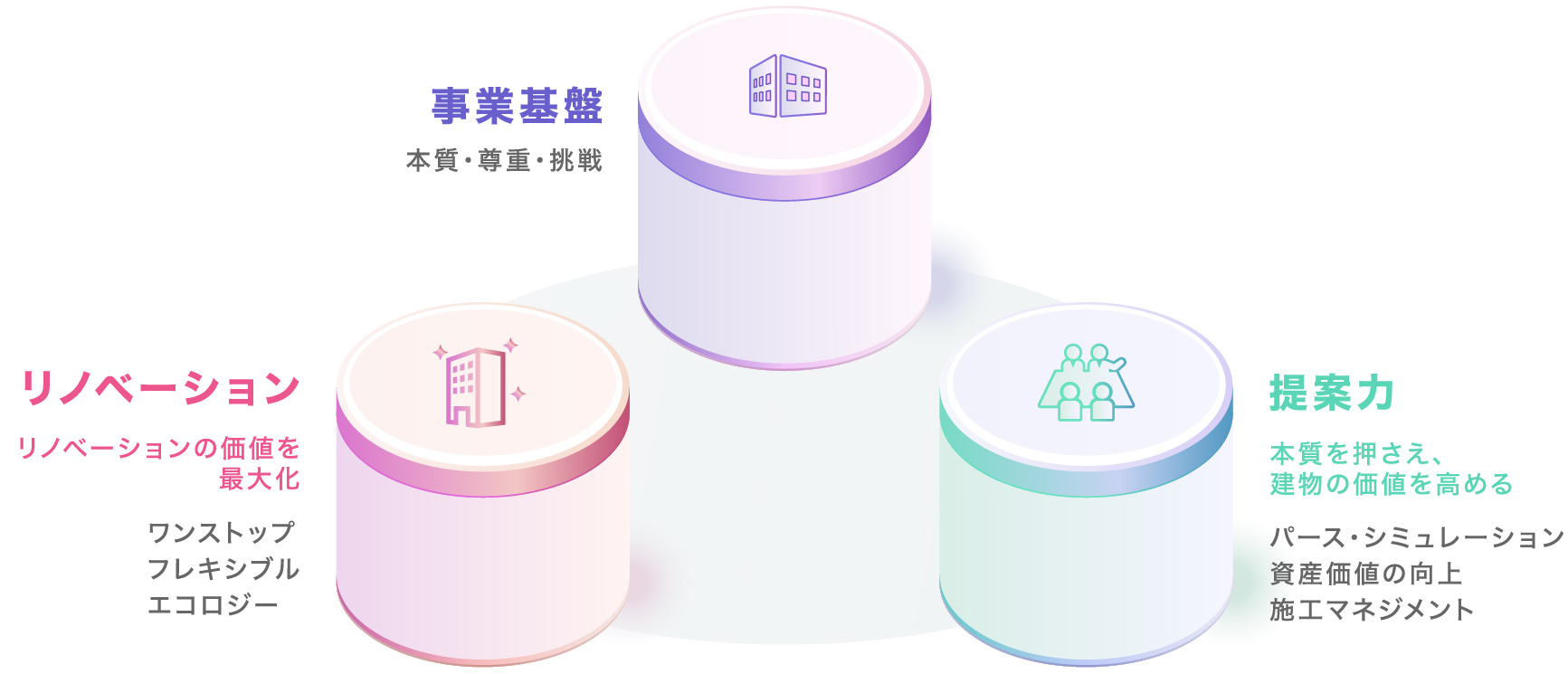 ワンストップソリューションにおける最大のメリットは「複数のことを一箇所で同時に進行できる」ことです。窓口を1つに集約することによって、「担当者に声をかければ、すべてを任せられる」「何か困ったことがあればすぐに担当者に相談できる」というお客様の要望に即座に応えることができます。 豊富な人材と経験と、工種を問わない施工体制を最大限活用し、お客様の多様なニーズにお応え致します。